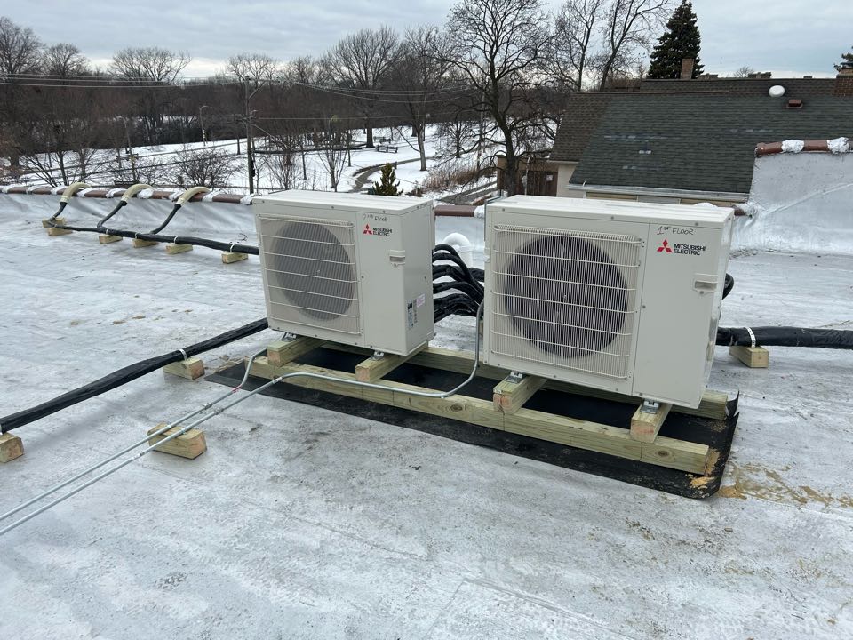 Chicago, IL - Tdh provide and install two new Mitsubishi ductless system for first and second floor with 9’indoor wall mount units. Run new copper lines, power lines and drain line with line hide covers on outside wall.